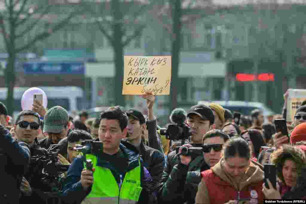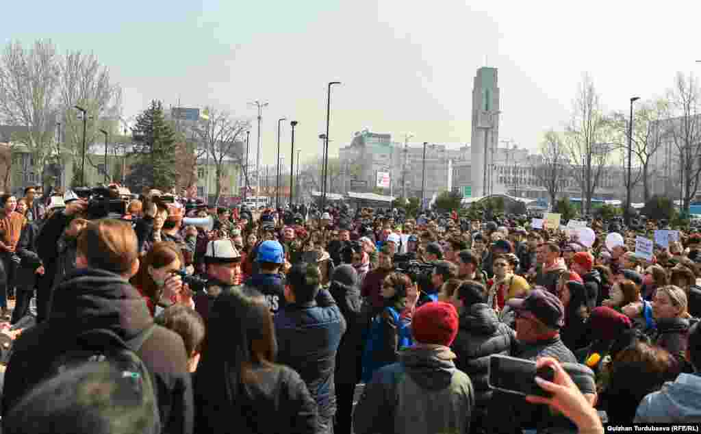 Уркуя Салиева атындагы «Революция каармандарынын» эстелигинин жанында аялдардын укуктарын коргоо акциясы өтүп, анда «Зордук-зомбулукка каршы!», «Эки жүздүүлүккө каршы!» деген өңдүү ураандар чакырылды. Акция саат 12:00до башталды.