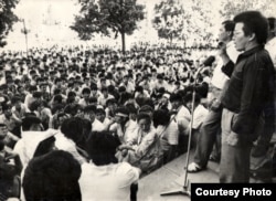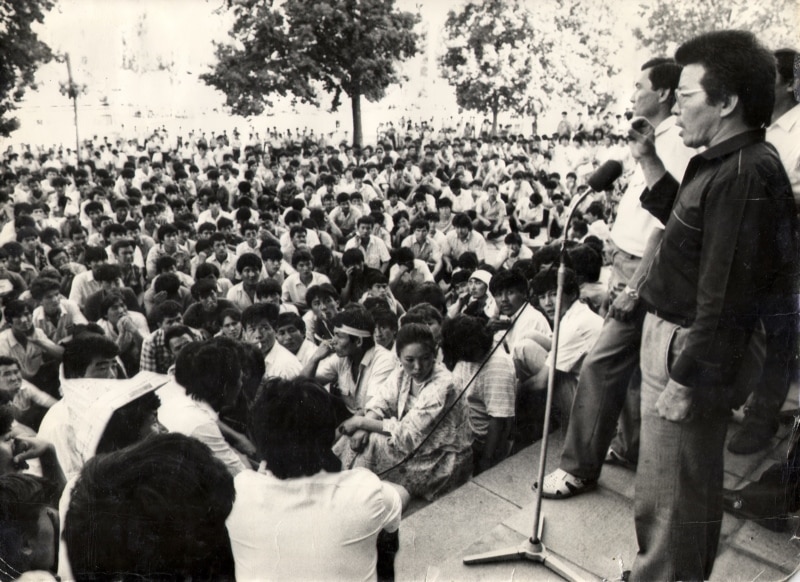 “Кыргызстан” Демократиялык Кыймылынын беш теңтөрагаларынын экөө - доцент Топчубек Тургуналиев (оңдогу биринчиси) менен Жыпар Жекше (оңдогу экинчиси) жумуриятта демократиялык реформаларды жүргүзүүнү жана Ош жергесинде 4-июнда башталган этностор аралык кагылышууну тез арада токтотууну талап кылган Бишкектин Борбордук “Ала-Тоо” аянтындагы ири нааразылык жыйынынын катышуучуларына кайрылышууда. 1990-жылдын 5-июну.