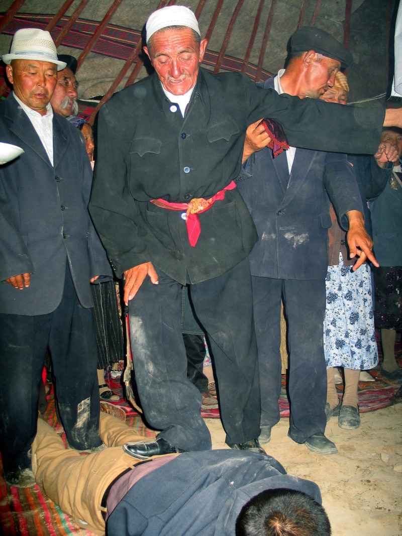 Даут Шомфай: Бакшы ооруп аткан, жин-шайтан кыйнаган же жинди болуп кеткен адамдарды бийге чакырып, тууну айлантып, аларды чапкылайт, камчы менен ургулайт, кээде жерге түшүрүп үстүнөн таптап, жин шайтанды чыгарабыз деп, ичиндеги жаман нерселерди кубалайт, бир убакта (жин-шайтан) чыгып кетет.